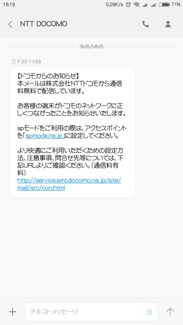 電源を入れて間もなく電波をつかんだようで、docomoからSMSが送られてきました。
