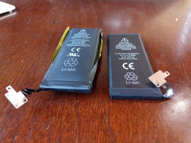 バッテリーを取り外して新品と比べてみましょう。古いバッテリーが膨らんでいるのがよくわかります。