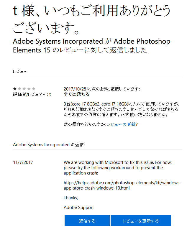 Microsoft Store版Adobe Photoshop Elements15をインストールして少し使用しましたが、すぐに落ちてしまい使い物になりません。