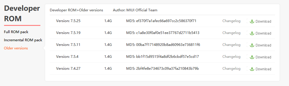 「Developer ROM」の「Older versions」をクリックorタップします。すると古いROMが現れるので、最新の7.5.25をダウンロードします。
